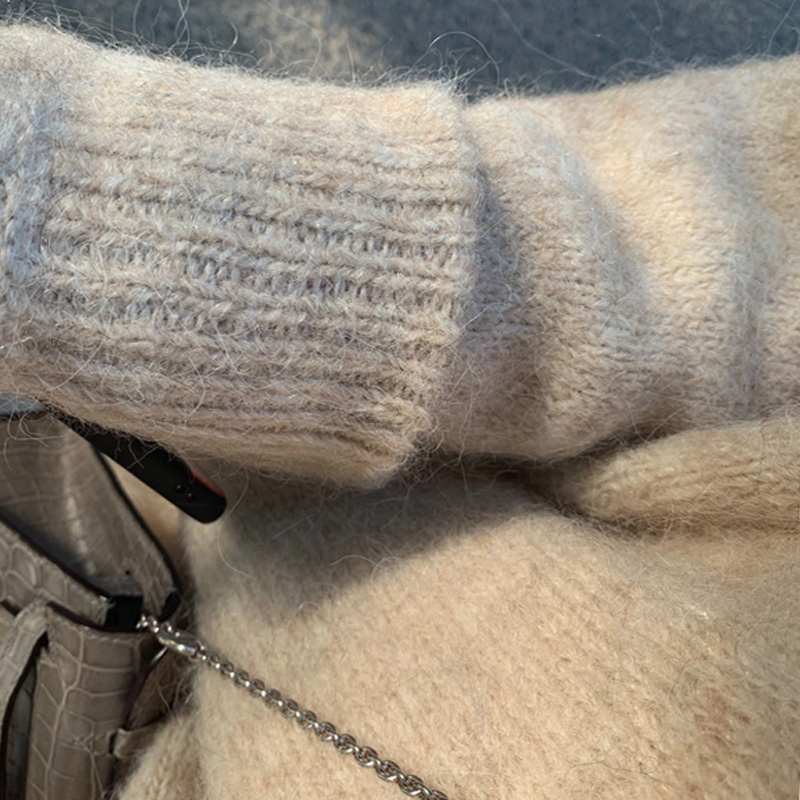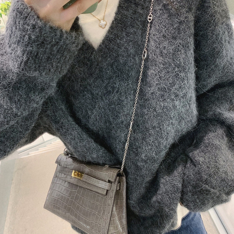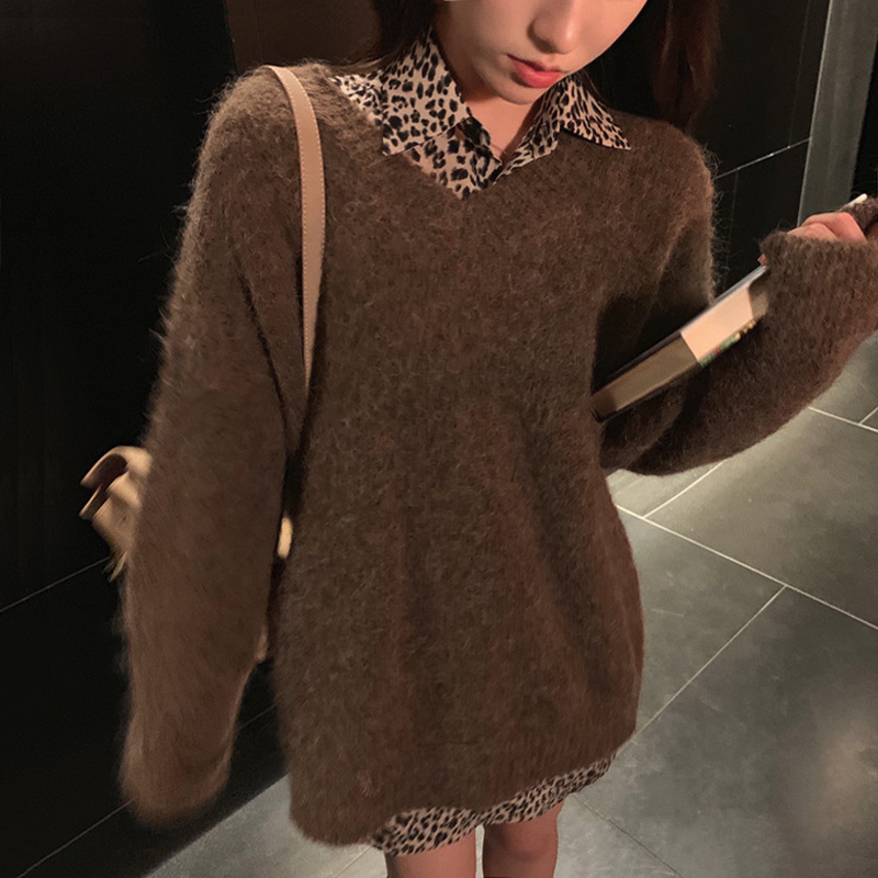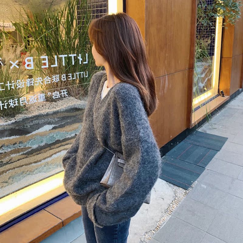 V-neck sweater women's autumn and winter loose outside wear lazy wind Korean version of retro simple solid color pullover sheep wool sweater