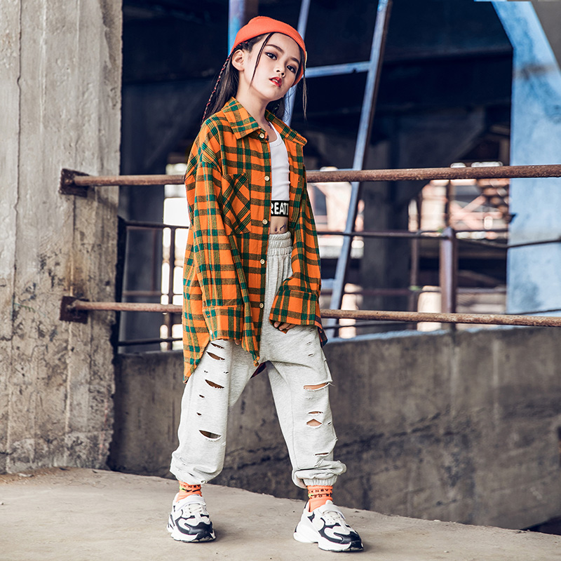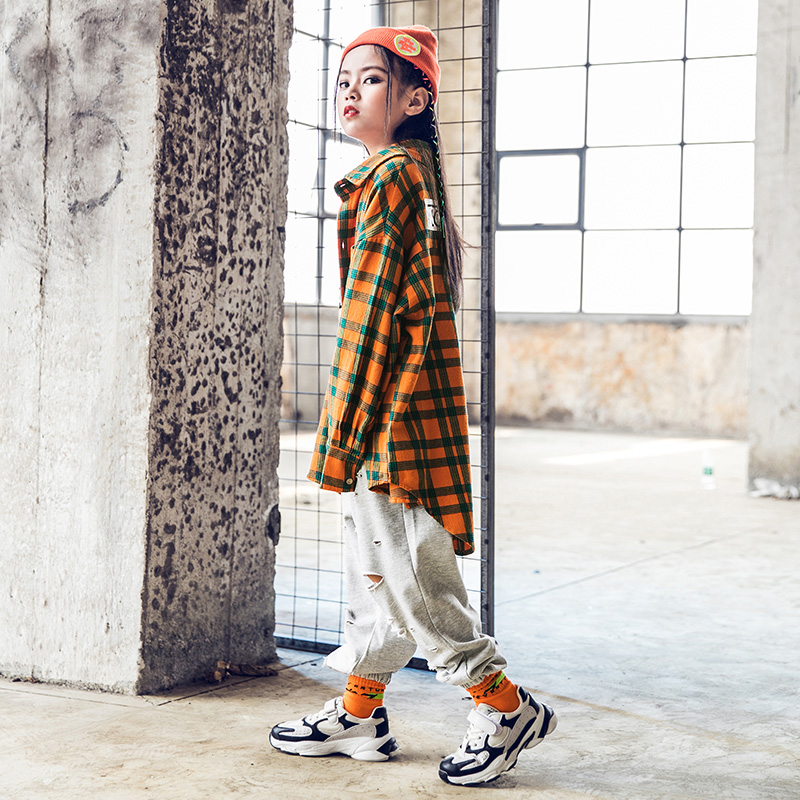 Children's hip-hop suit girls loose hip-hop jazz dance plaid show clothing boys ripped trousers trend - Taobao