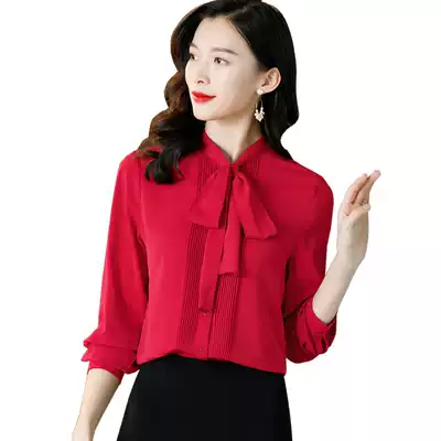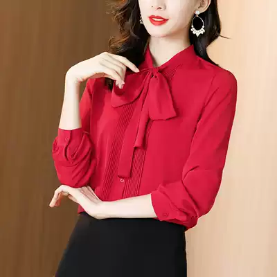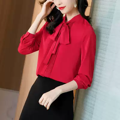 Red bow professional shirt women's long sleeve Autumn New chiffon top temperament has a hanging streamer white shirt