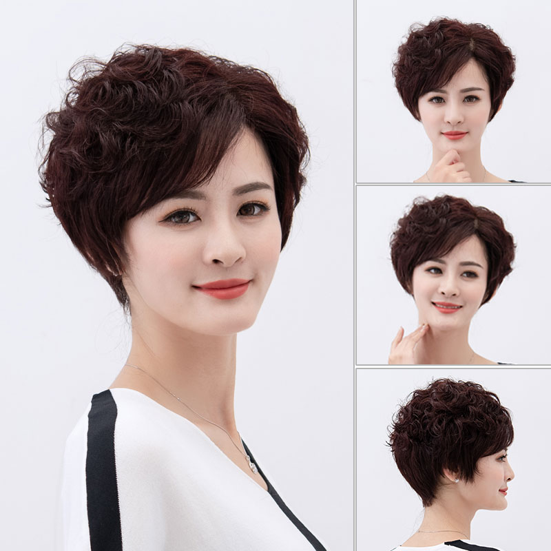 Wig female short hair short curly hair oblique bangs real hair full head set fluffy natural real hair silk middle-aged and elderly wig set