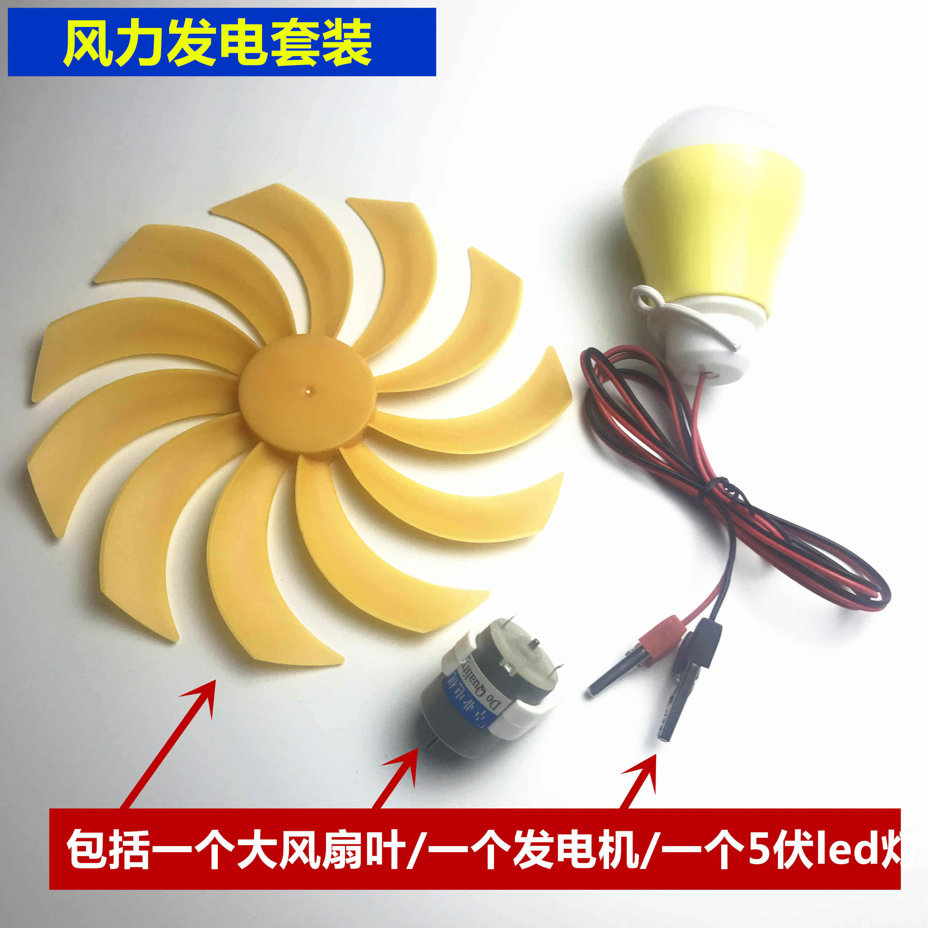 Big Wind Power Set (with 5 Watt Headlights) Big Wind Power Set (with Bike Stand) 1 x 5 V 5 W LED Light 1 x 1 17.5 cm Fan Blade 1 x 280 Generator Big Wind Power Set (with Red and Yellow LED Lights) 10 Sets of Wind Power Generation Set (with Red and Yellow LED Lights) 10 Sets of Wind Power Generation Sets (with 5 W Headlights)