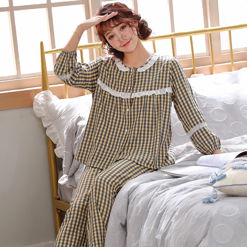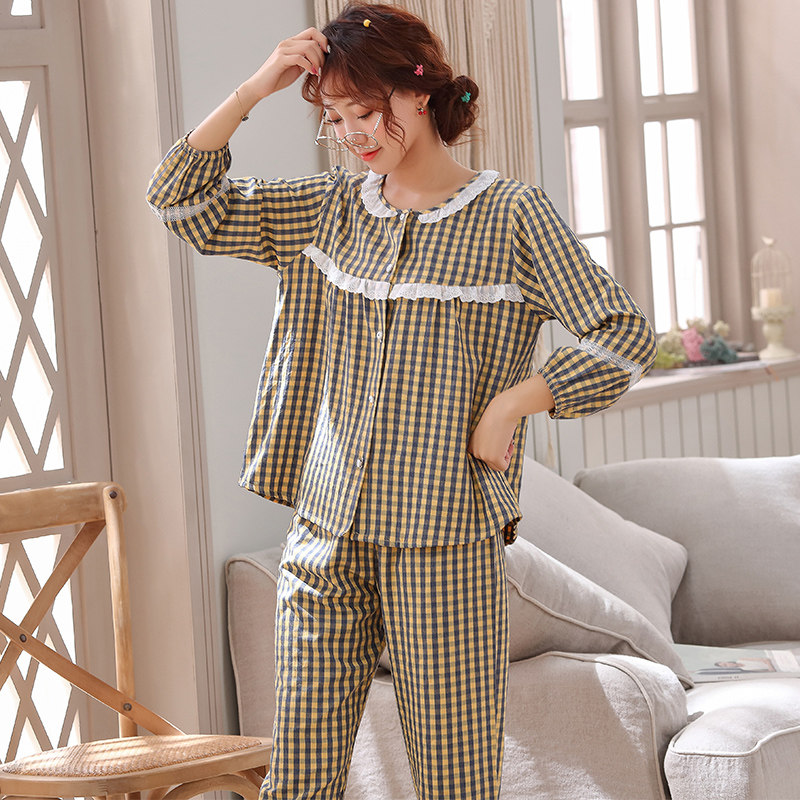 Plaid pajamas ladies spring and autumn cotton long sleeve cardigan suit Korean ins simple student home clothes can be worn outside