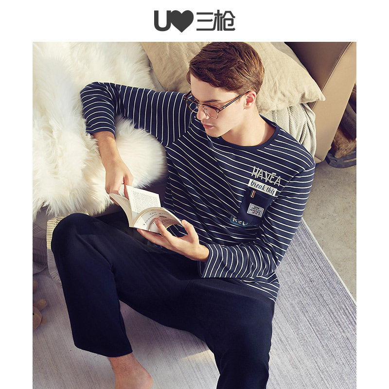 Three-gun pyjamas for men and women Abrasive Elastic Cotton Autumn Winter Colored Strips Printed Cotton minimalist casual couple's home suit