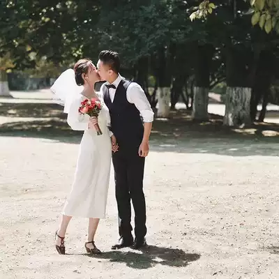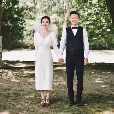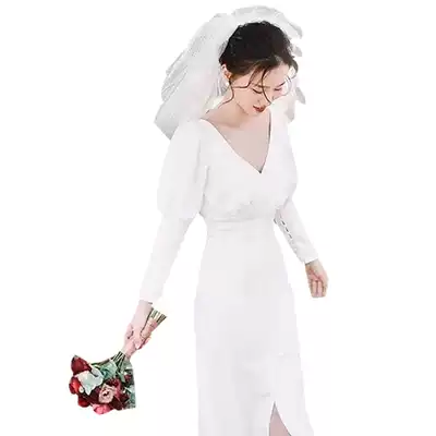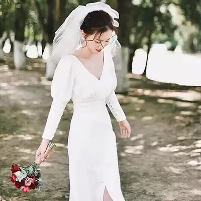 White evening dress deep V collar 2021 New banquet ball temperament little dress retro light wedding engagement dress