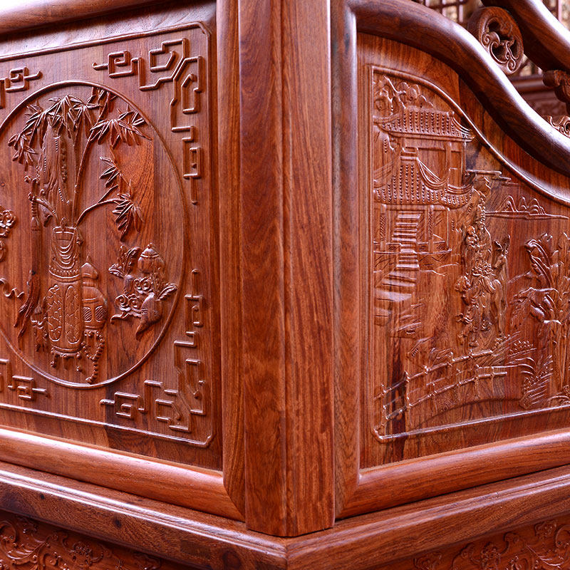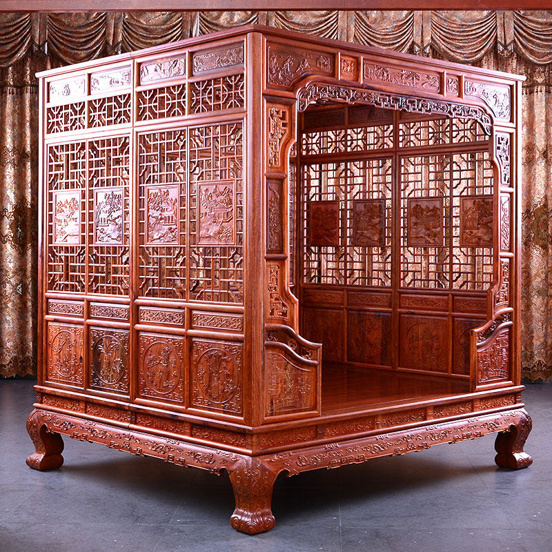 Mahogany Myanmar rosary New Chinese shelf bed Moon hole bed Solid wood double bed Antique Ming and Qing thousand workers pull-out bed