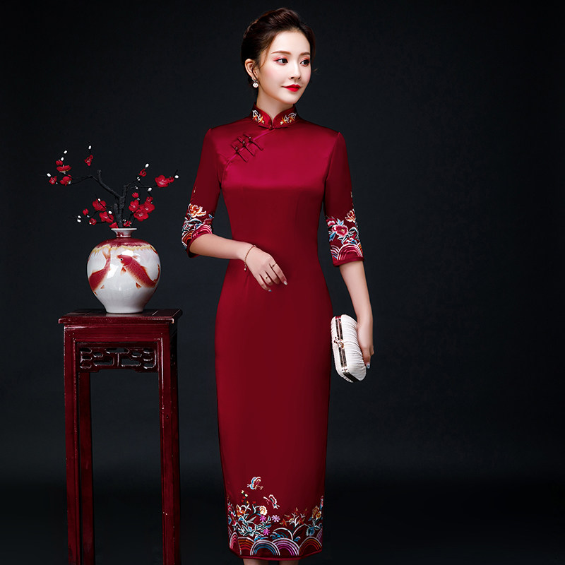 Medium-long version Wedding wedding happy lady's wedding dress embroidered qipao dress acetate satin wedding gown 2022 new