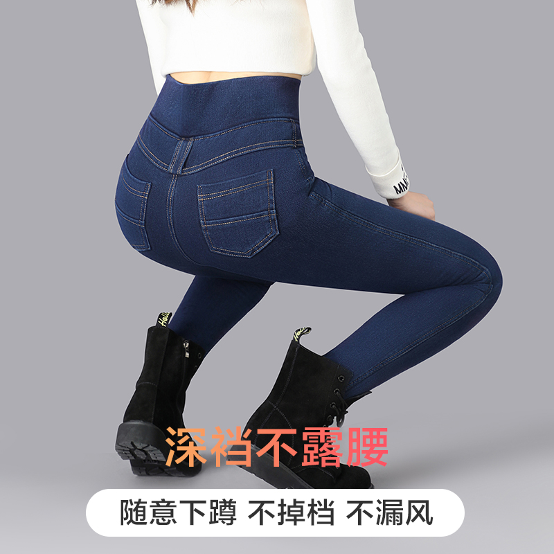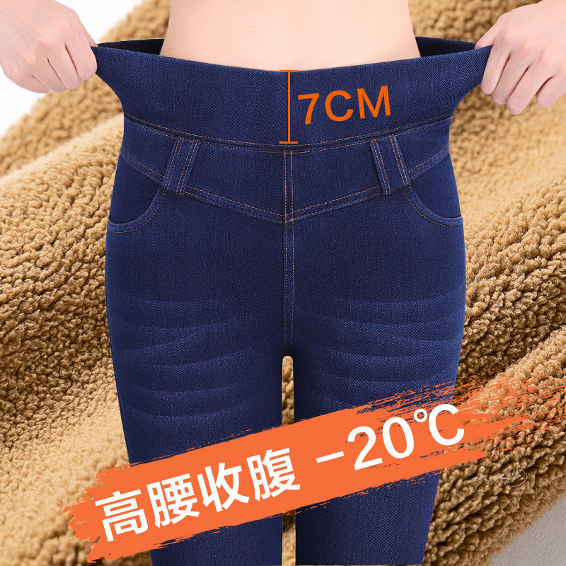 Plush jeans women 2021 new lamb down high-waisted small leg pants winter elastic waist appear thin and thicker
