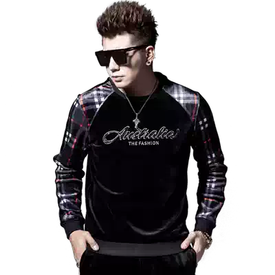 Yukou Wei Yi Men's Tide Brand Winter Golden Velvet Thick Slim Trend Plaid Embroidery Men's Thick T-shirt Top