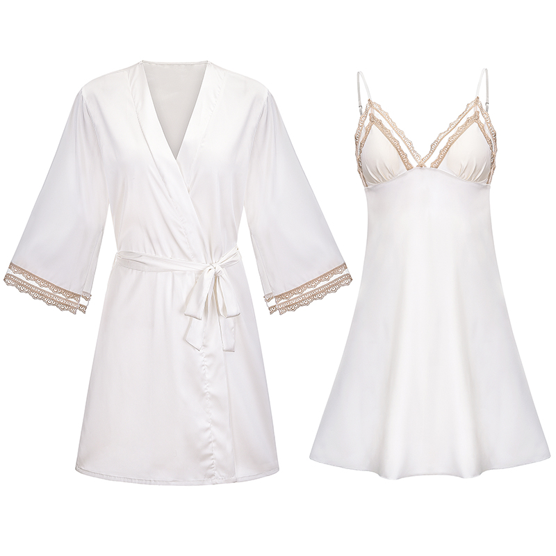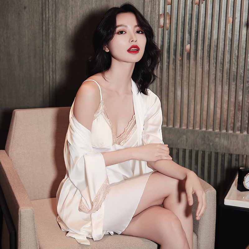 Spring and autumn sexy pajamas women with chest pad ice silk nightdress two-piece mood hanging underwear home service thin nightgown summer