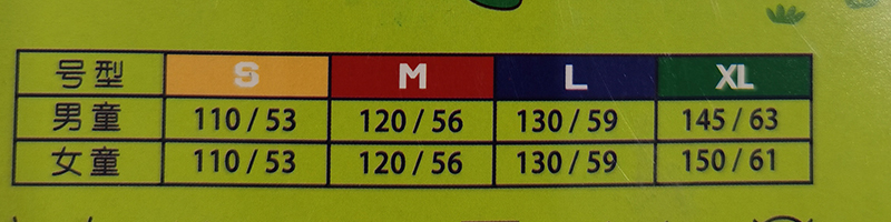 S Recommendation (height 110 weight 53)M recommendation (height 120 weight 56)L recommendation (height 130 weight 59)XL recommendation (height 150