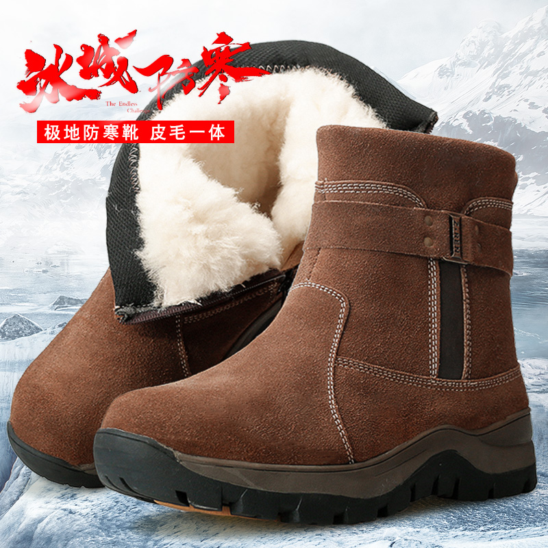 Winter Tohoku Outdoor Snow ground boots Male fur integrated genuine leather wool cotton boot thickened waterproof non-slip high cylinder cotton shoes