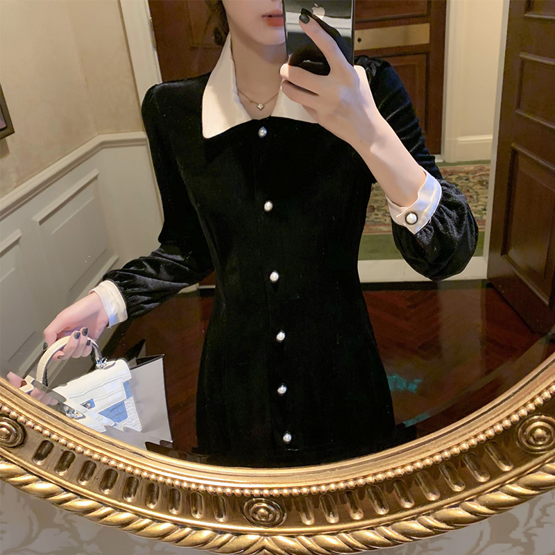 Fish Rabbit's Rabbit Autumn Winter Retro Temperament Collection Waist Velvet Dress Black Medium Long Version Hitch Underskirt
