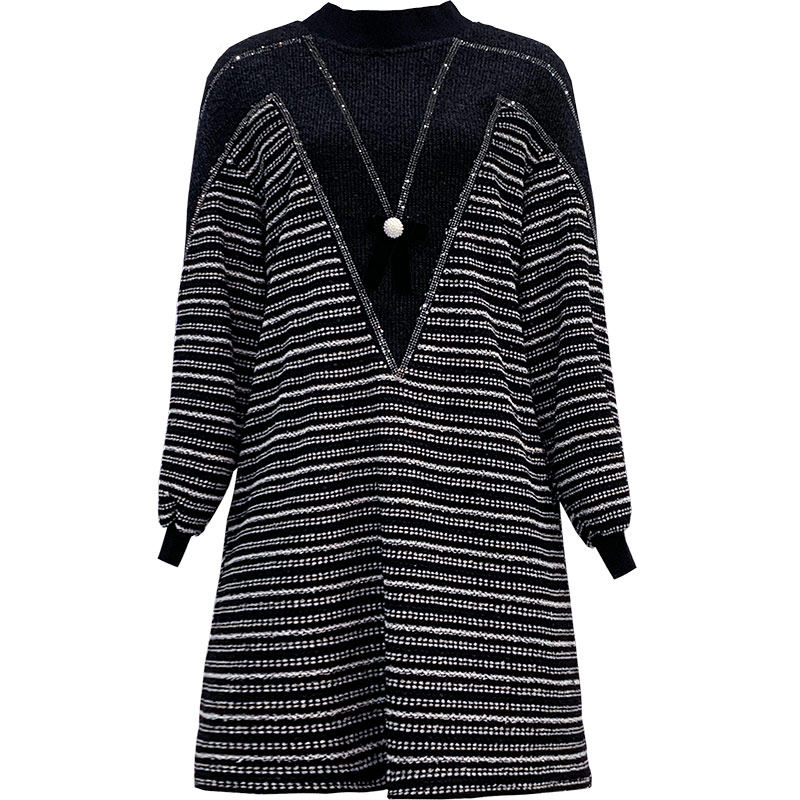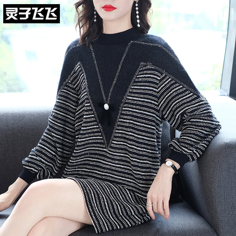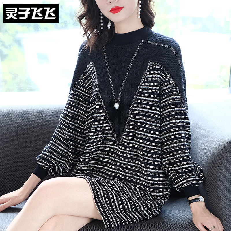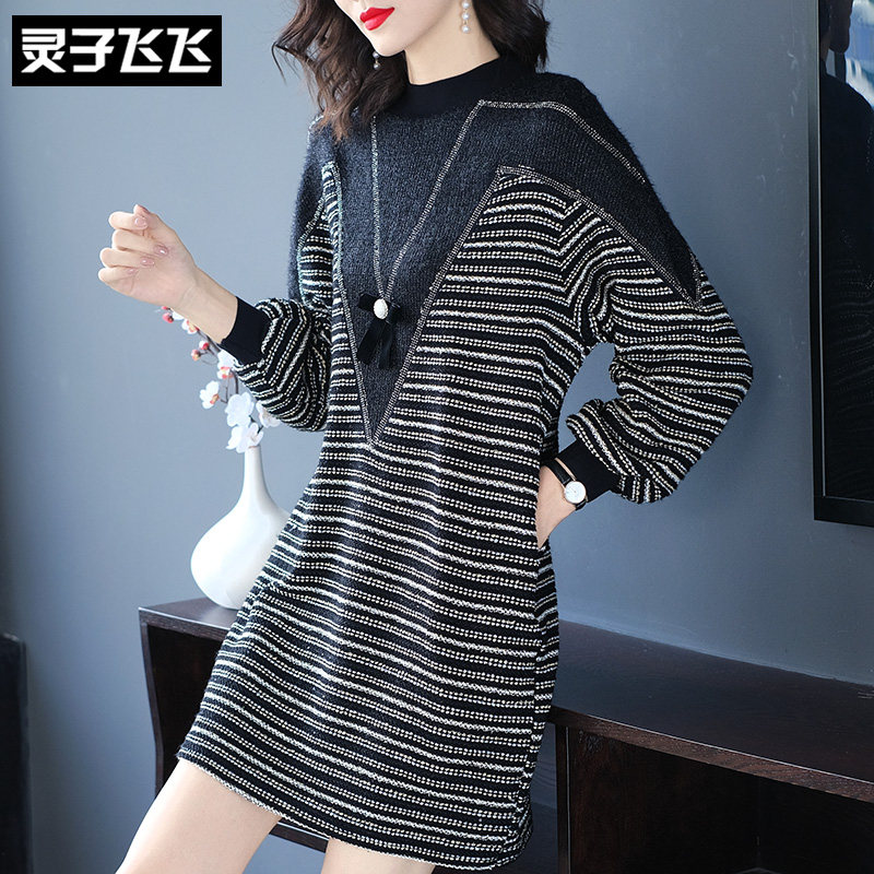 Autumn and winter loose large size fat mm cover the flesh and show thin black high-neck lantern long-sleeved shiny sweater knitted dress