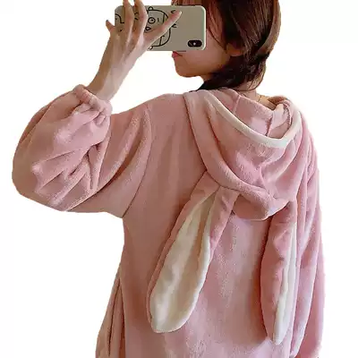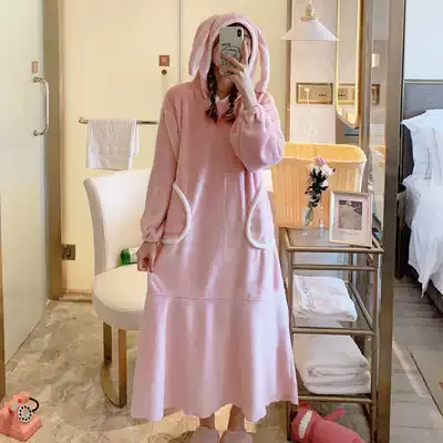 Night dress women's autumn and winter models thickened and velvet lengthened Korean version of the student cute and sweet pajamas women's autumn and winter home clothes