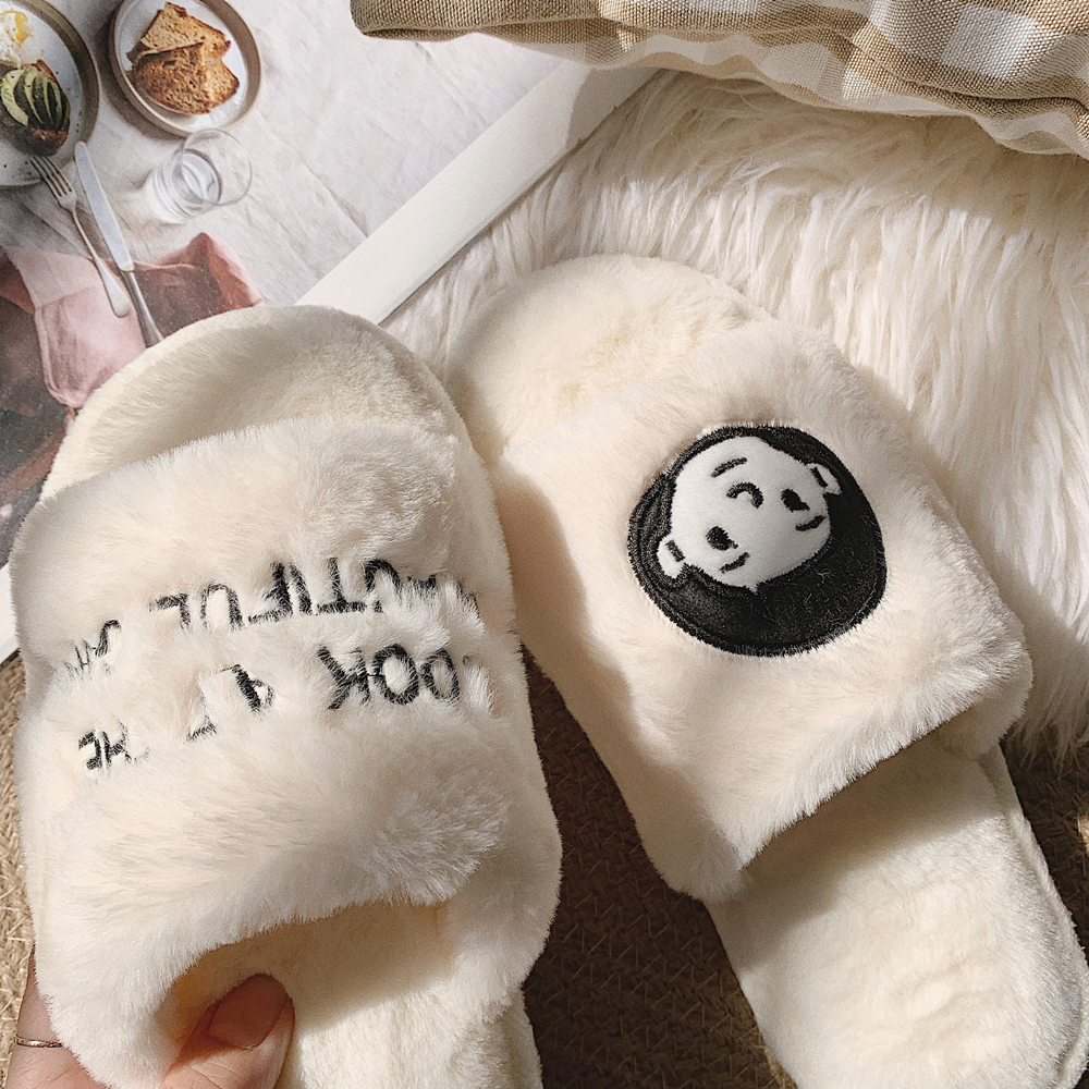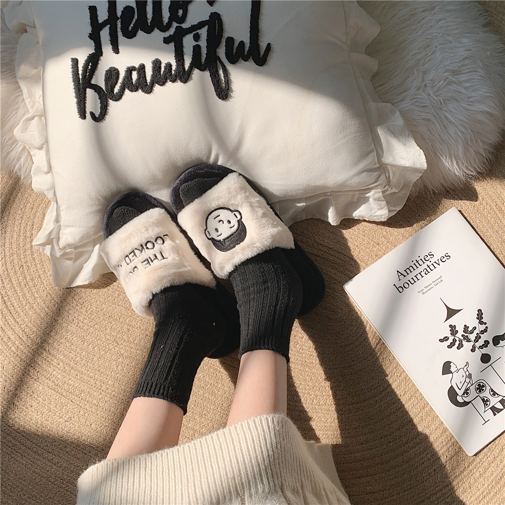 Korean Version Winter Chic Cartoon Lovers Cotton Tug Cute Flat Bottom Fur Tug Comfort Moozi Home Cotton Slippers Non-slip