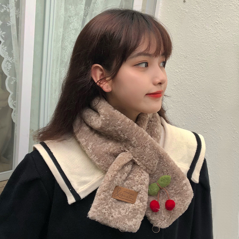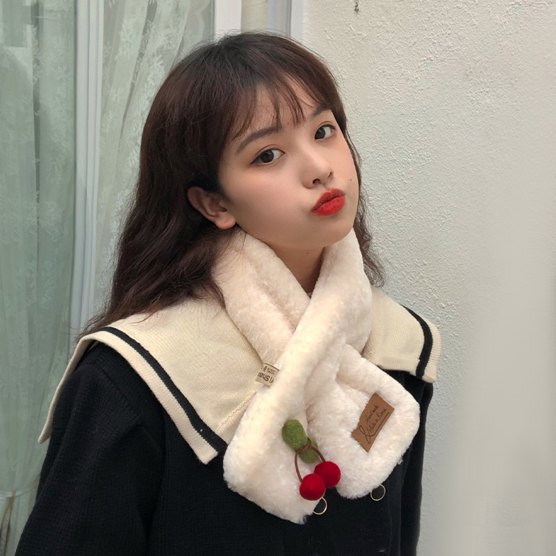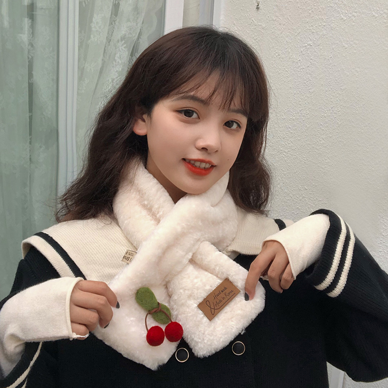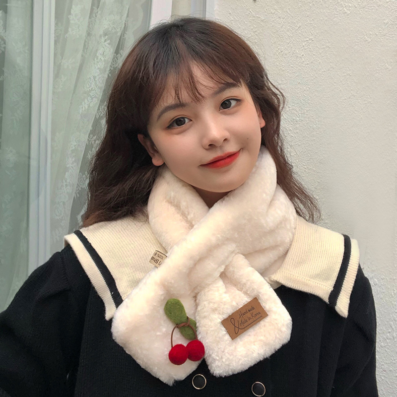Cute plush cross scarf female winter Japanese students keep warm all-match cold-proof cherry Korean version Dongdaemun scarf