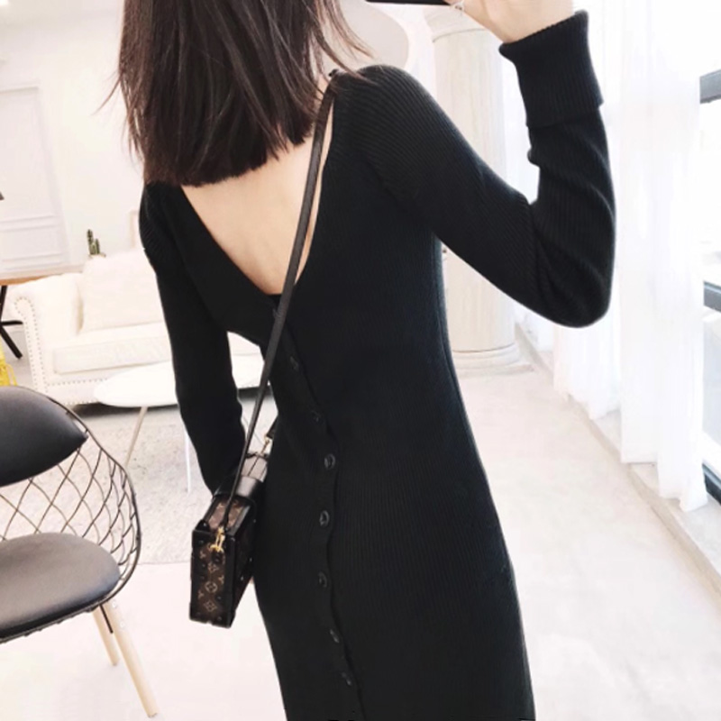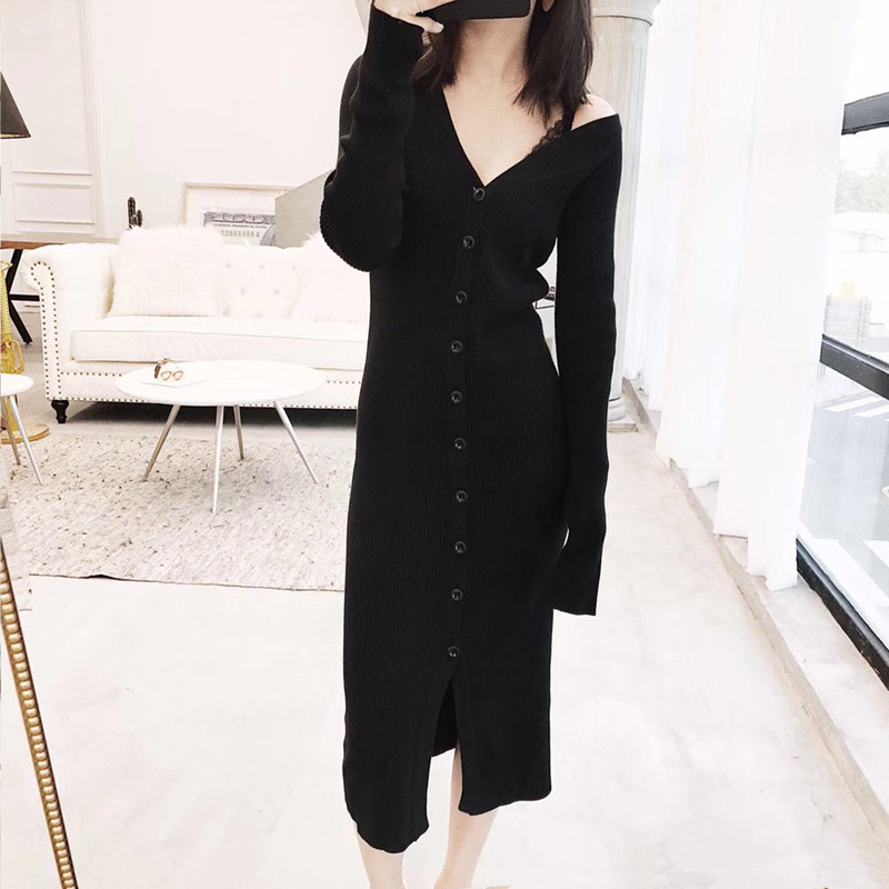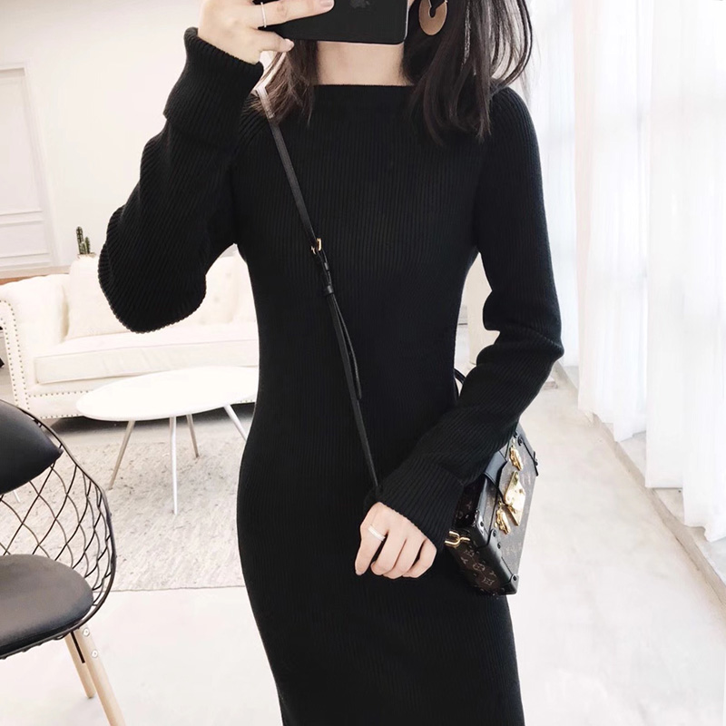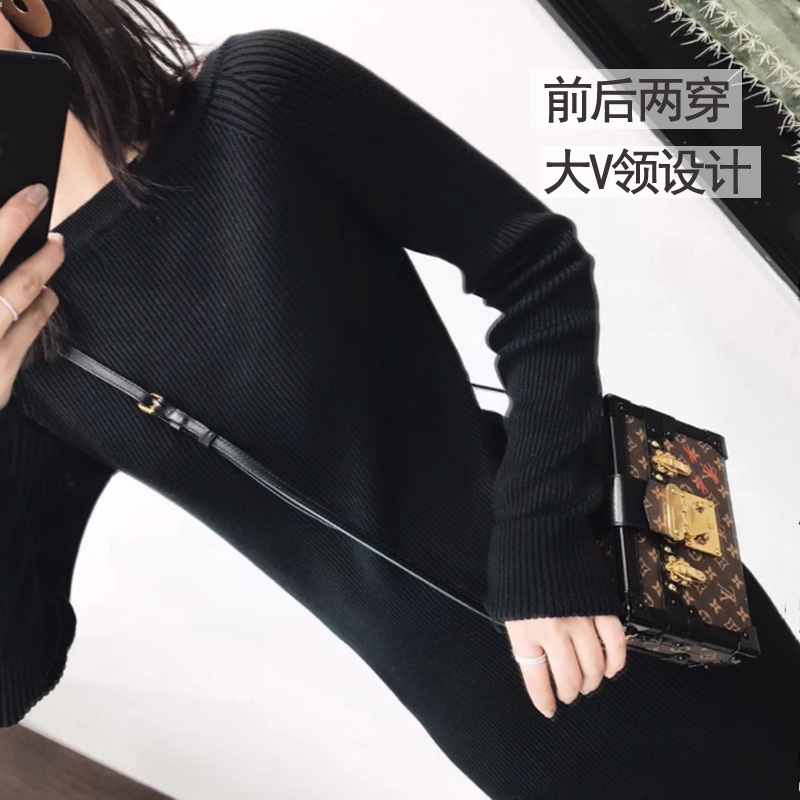 Black knitted dress women's spring and Autumn slim V-neck sexy tight inner wool long-sleeved bag hip inner skirt