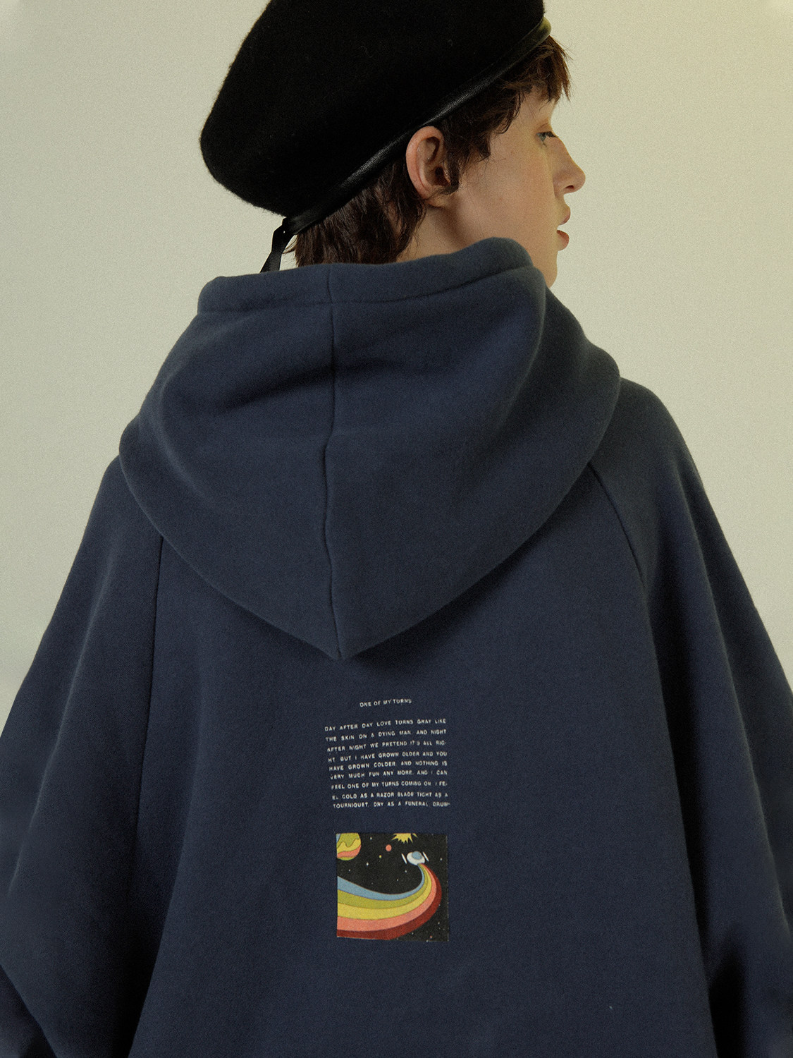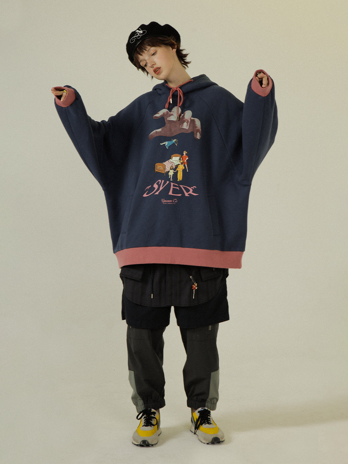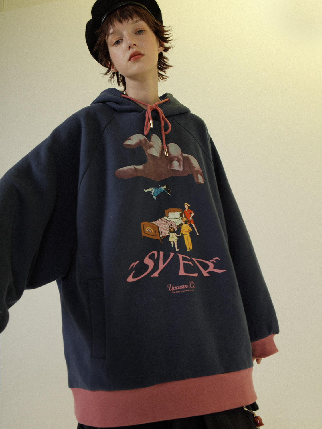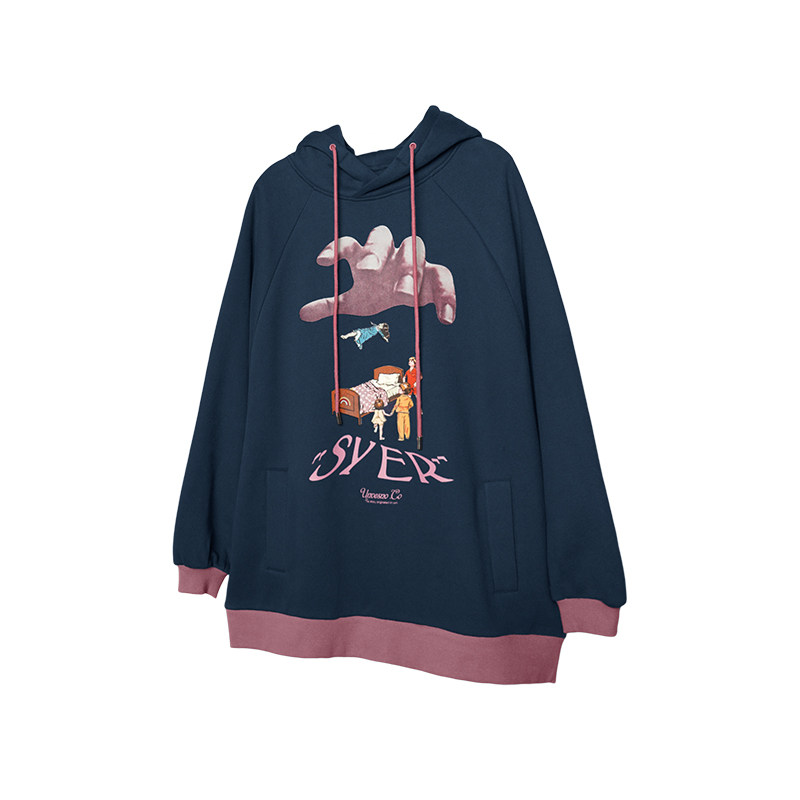 UNVESNO ORIGINAL RETRO cartoon print WINTER VELVET COUPLE WARM loose pullover fake two hooded sweatshirts