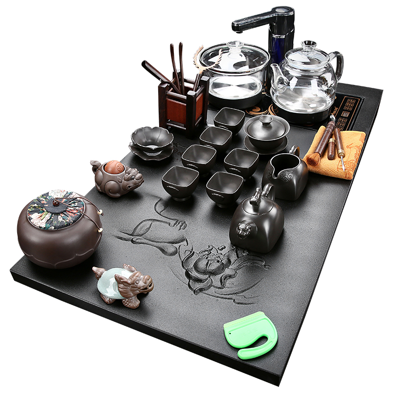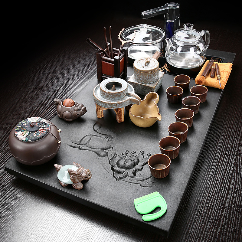 Large black gold stone tea tray Kung Fu tea set Automatic induction cooker integrated modern embedded tea table Tea sea