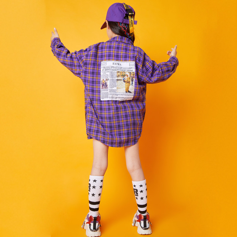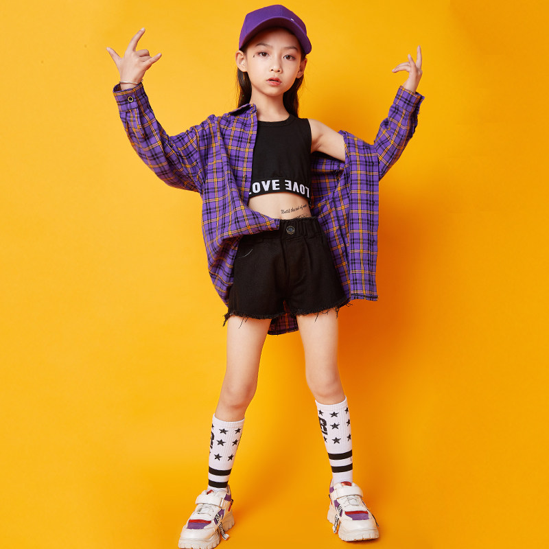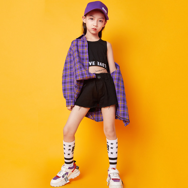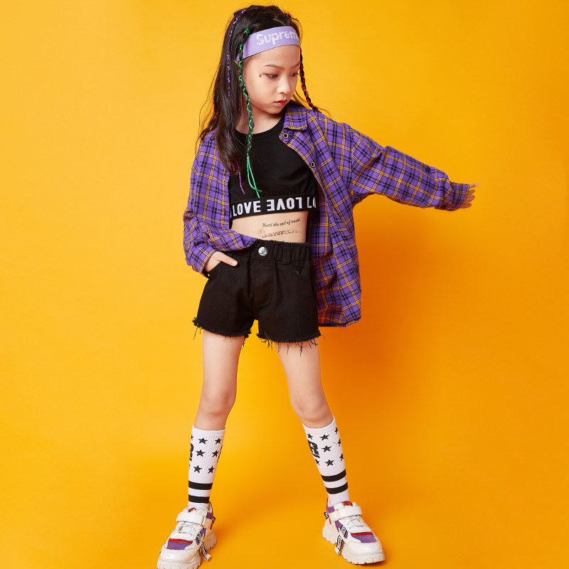 Purple plaid shirt, black LOVE vest, black shorts, purple plaid shirt, black LOVE vest, black shorts, purple hairband, star socks, purple plaid shirt, black LOVE back