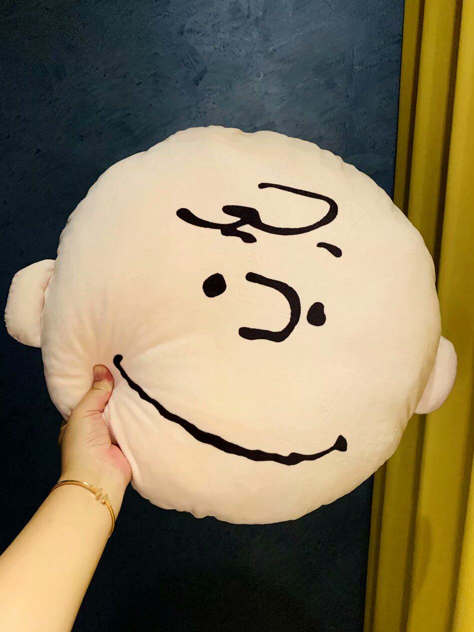 Sannu is holding a pillow Charlie with a pillow burnt and coated.