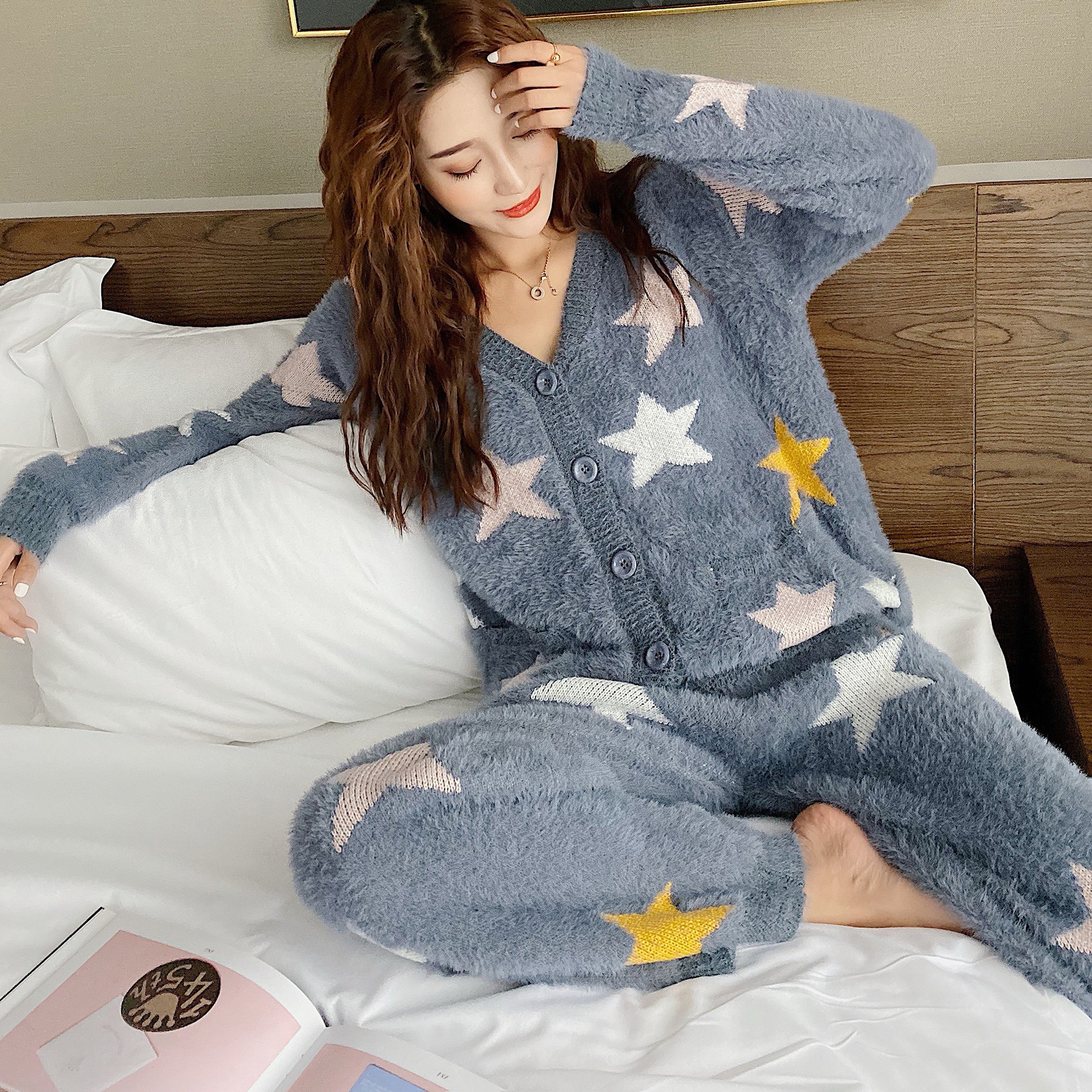 ins Simple autumn and winter thickened warm star cardigan soft imitation mink velvet women's pajamas can be worn outside home clothes