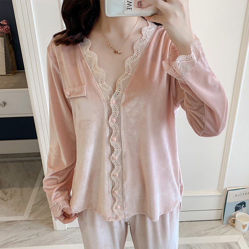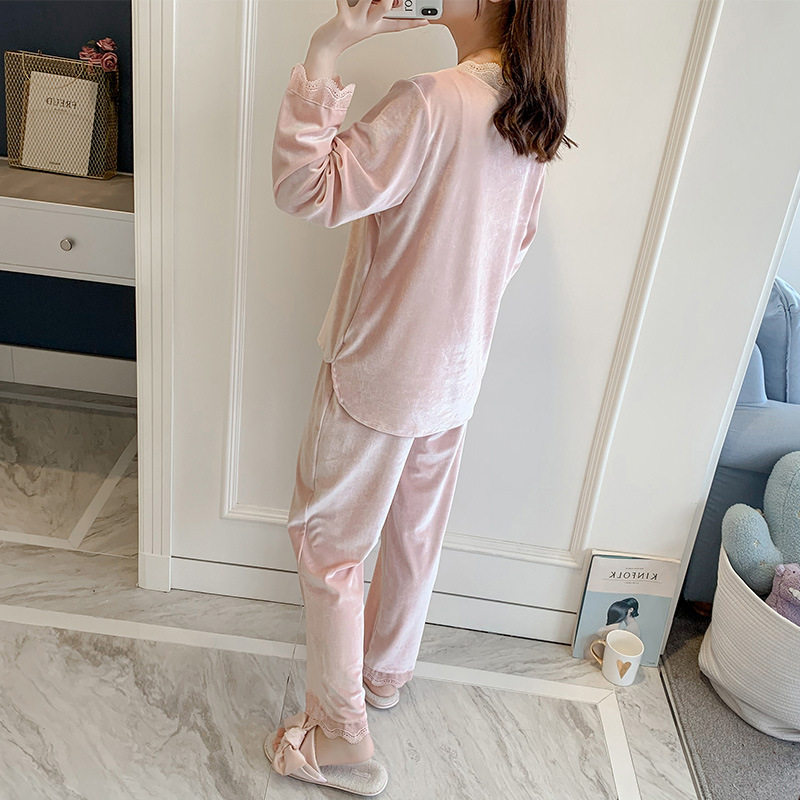 INS wind gold velvet simple sweet lace pajamas suit women's autumn and winter net red can wear fashion home clothes