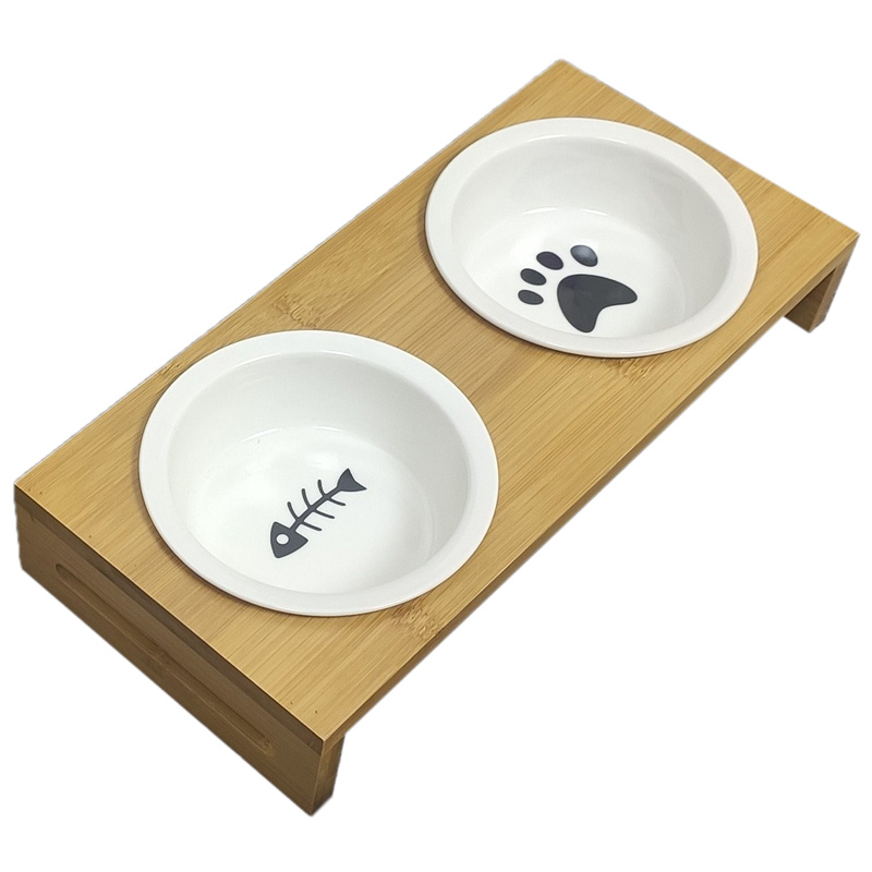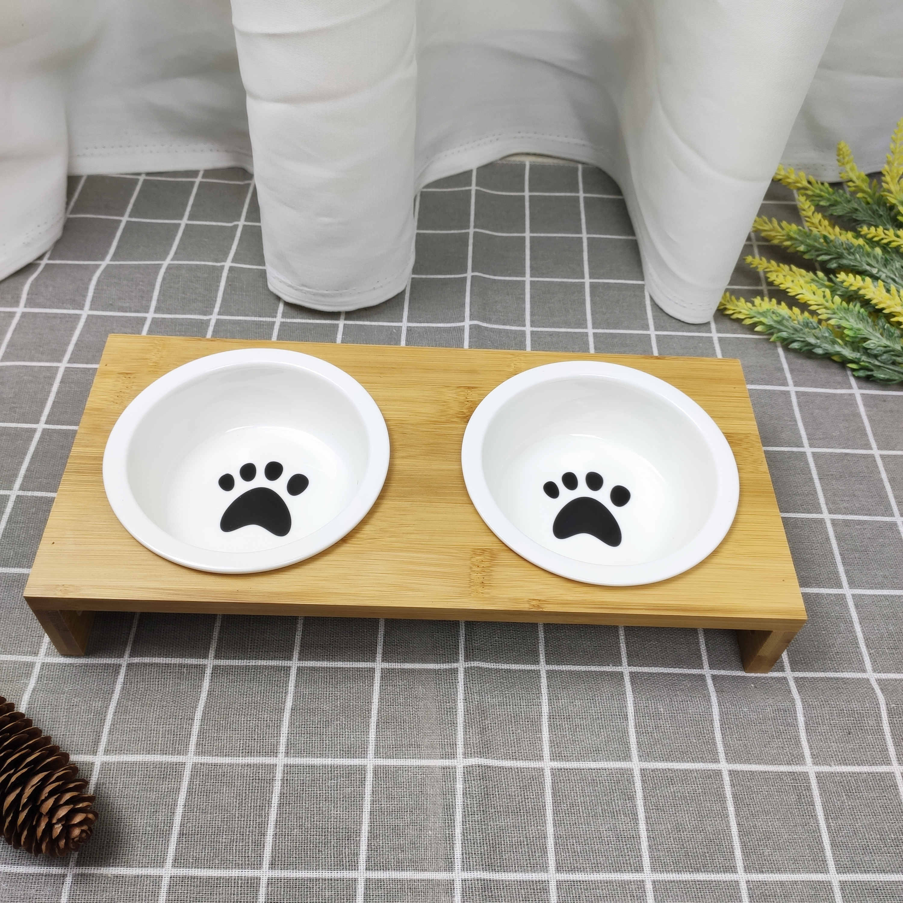 Cat Bowl Ceramic Neck Guard Bamboo Wood Shelf Pet Double Bowl Simple Cat Food Basin Non-slip