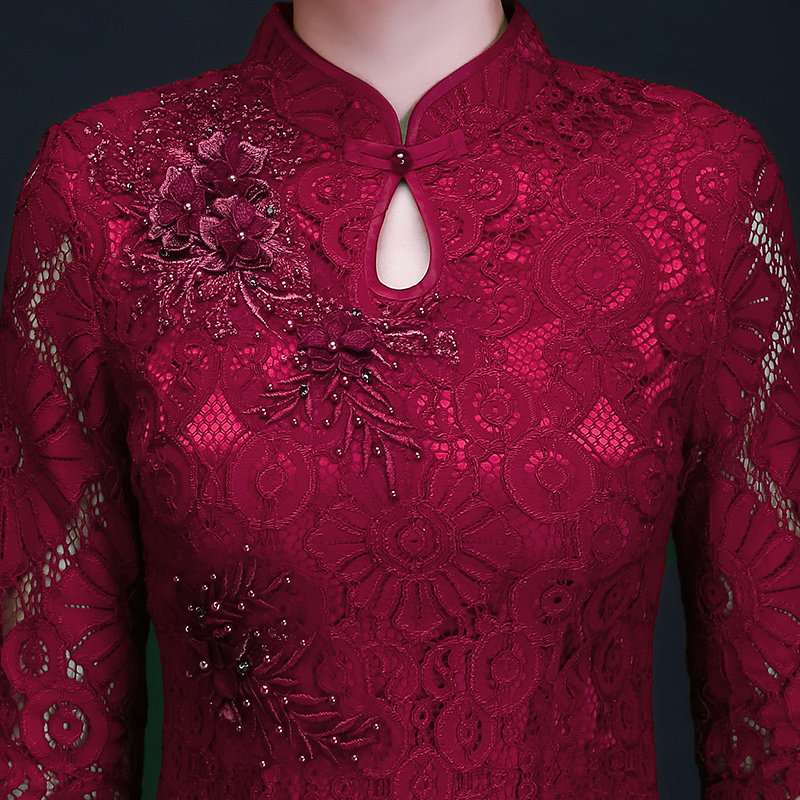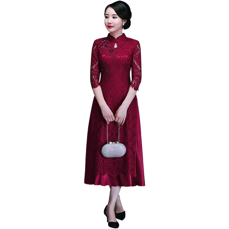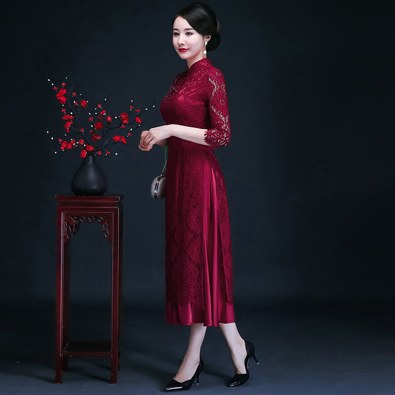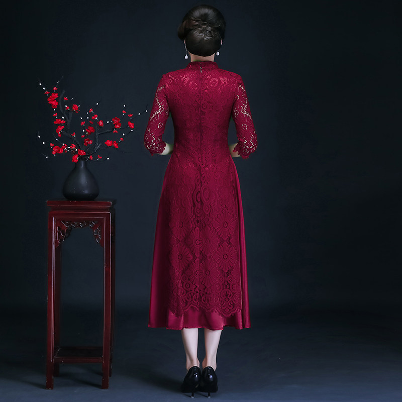 Aodai mother dress wedding cheongsam dress improved lace mid-length version red wedding dress dress happy mother-in-law cheongsam