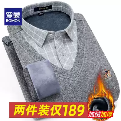 Romon Romon winter plus velvet thickened warm shirt men's fake two-piece business casual loose sweater shirt