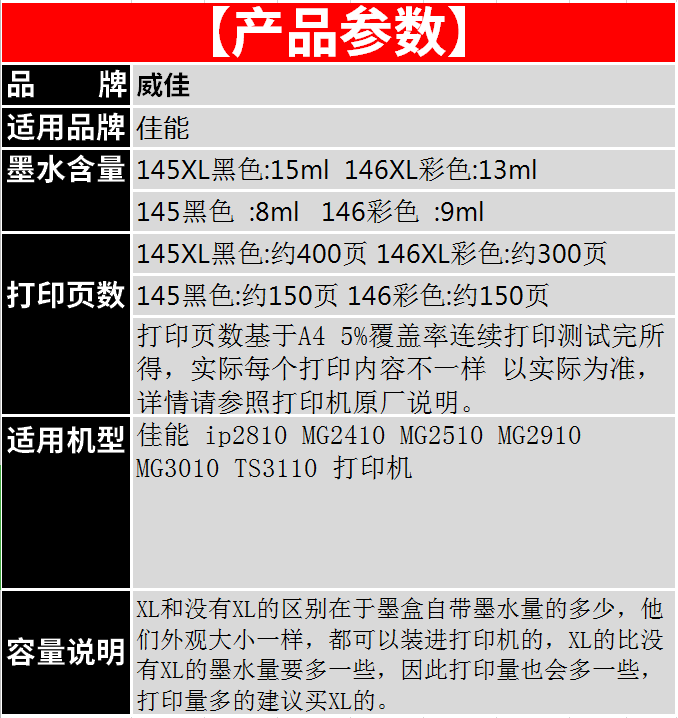 Weijia PG145 145XL 146 Ink cartridge Canon 145 Black Ink Cartridge IP2810 MG2410 MG2510 MG2910 MG3