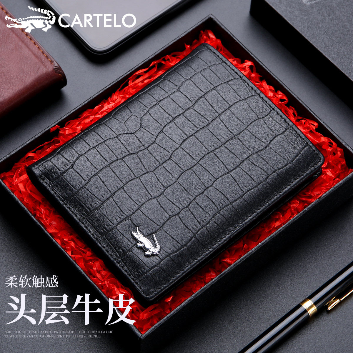 Caravan Crocodile Crocodile Purse Male Crocodile Textured Calf Leather Short money clip Fashion minimalist Clamping Leather Wallet