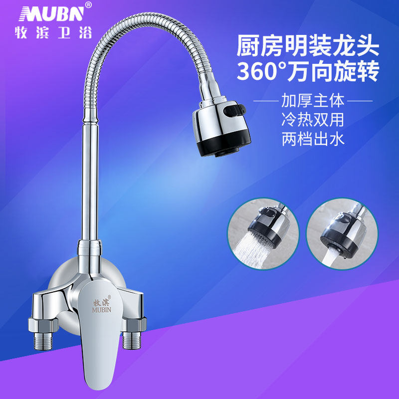 All-copper surface mounted kitchen hot and cold water faucet mixing valve Wash basin Sink basin Wash basin Open pipe wall-mounted