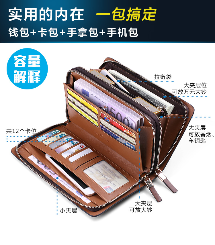 Emperor Paul Handbag Male Leather Double Zip Business Handbag Men's Wallet Long Capacity Handbag