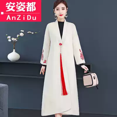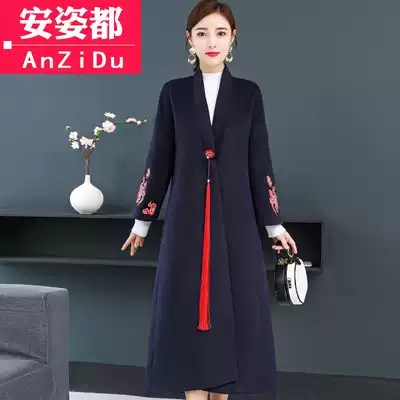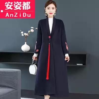Hairy coat women's autumn and winter long version of Chinese clothes improved woolen coat Chinese style women's tea clothing Zen woolen coat