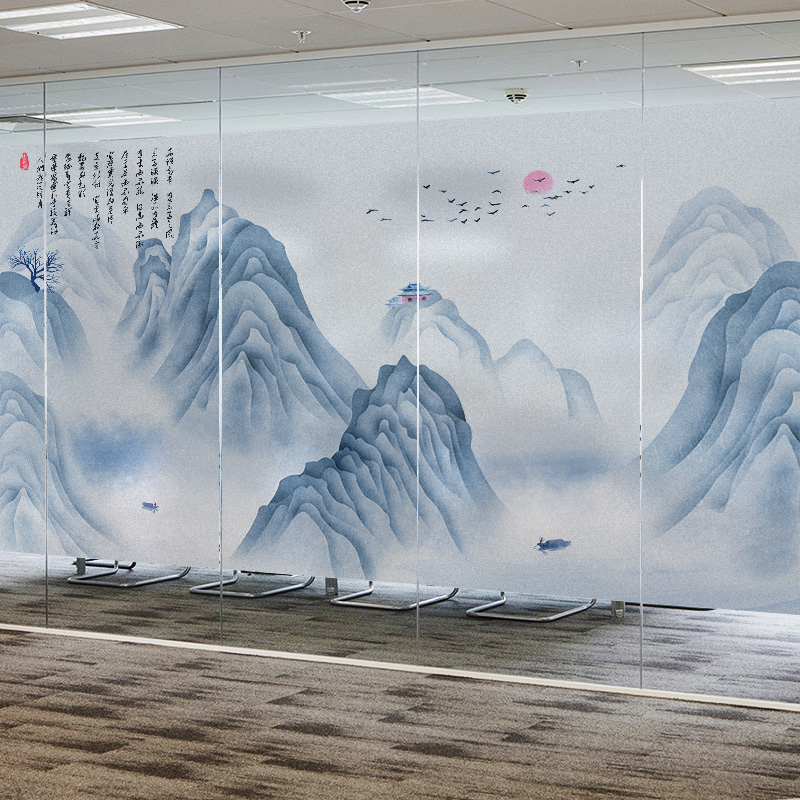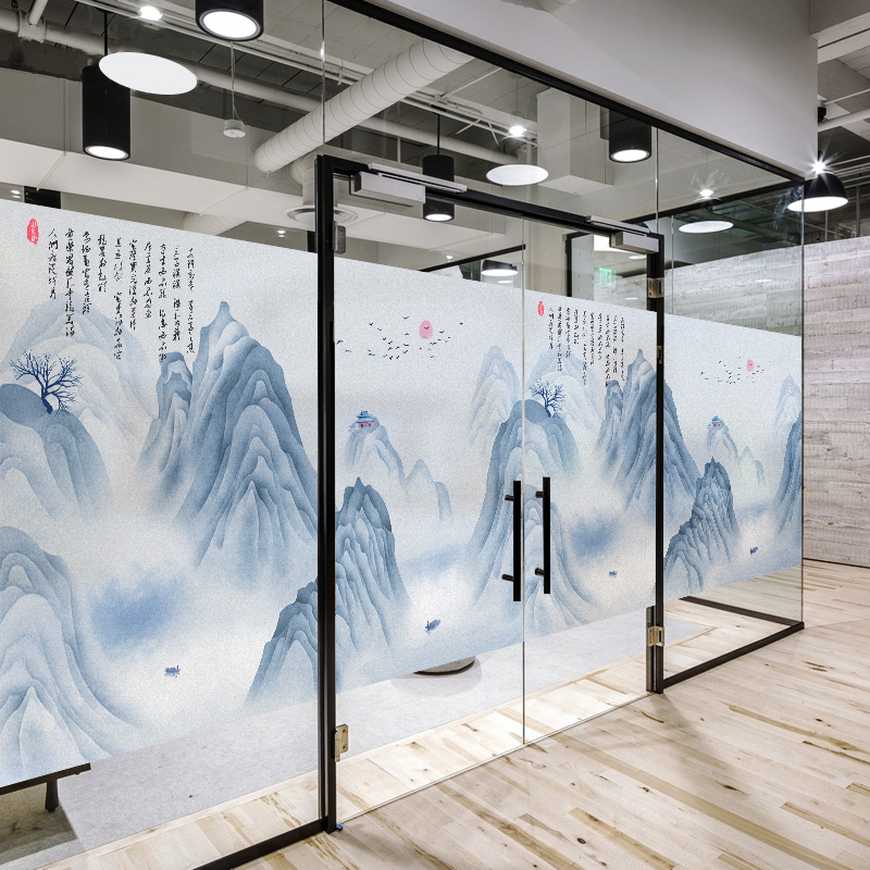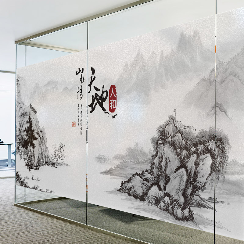Ink landscape ancient style can be customized Electrostatic frosted living room glass sliding door Office glass film cellophane