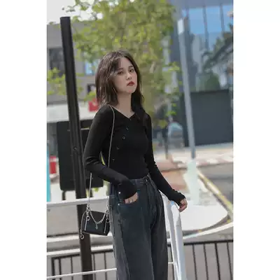 "You Alley" Knitted Sweater Women's 2021 New Autumn V-neck Design Sense Sweater Black Slim Slim base shirt