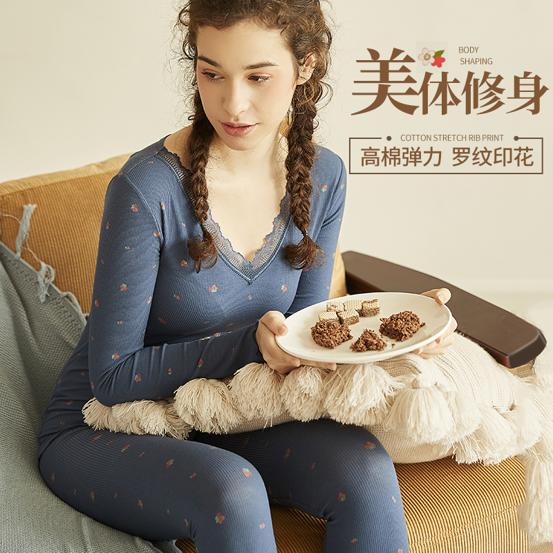 Dingpipi flagship women's long johns warm cotton thin underwear lace v-neck thin section printed slim top melon