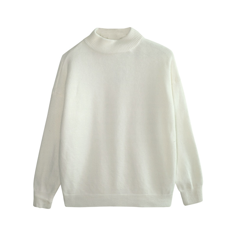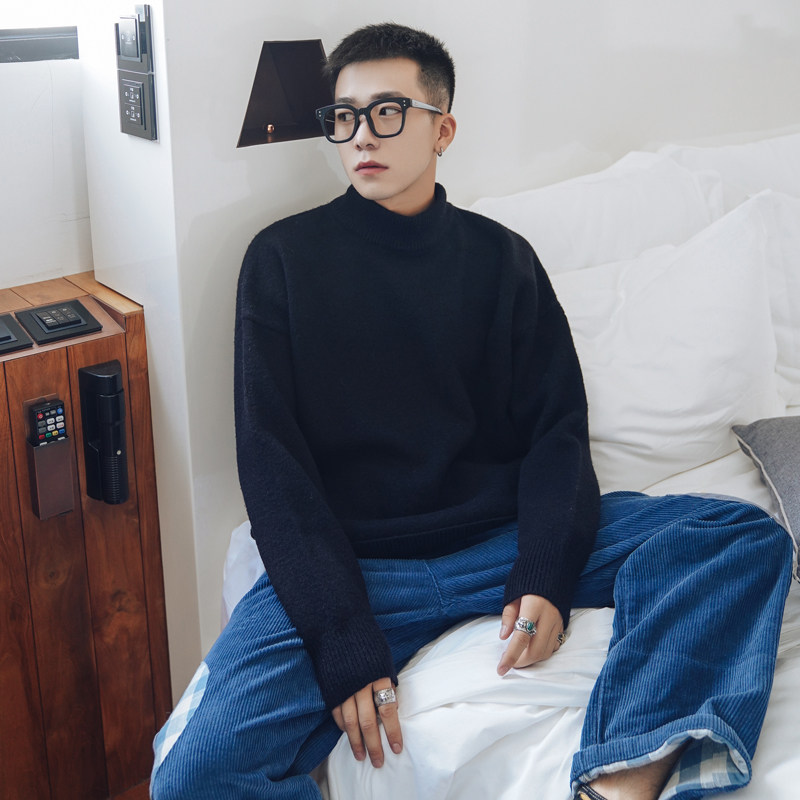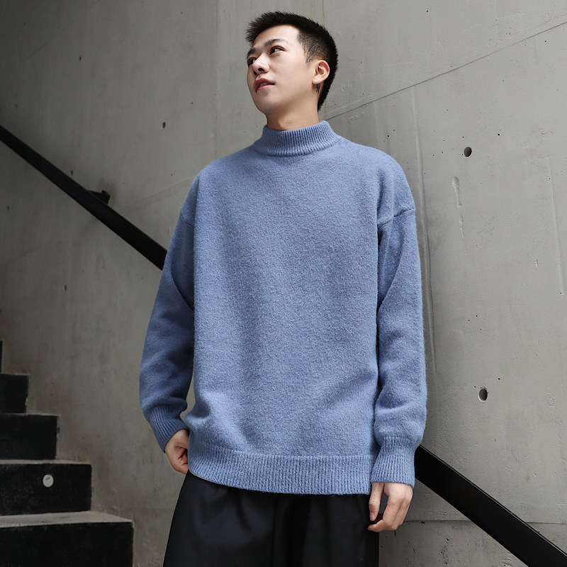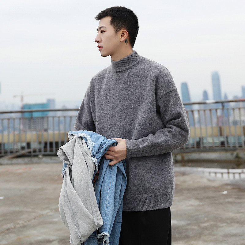 Winter pure color half high collar thickened warm sweater male trend stitch cardiovert Korean version sleeve head loose white woolen sweater