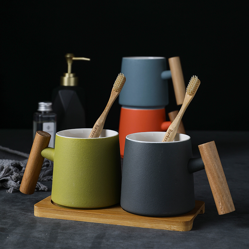 Ceramic mouthwash cup with wooden handle couple set toothbrush cup wash cup tooth bowl pair creative Chinese mouthcup for home