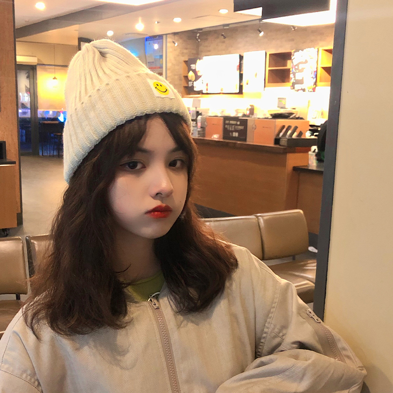 ins net red hat women's autumn and winter ear protection knitted wool hat cloth stickers smiley Japanese Korean version all-match casual men