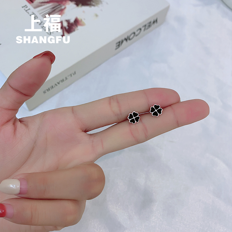 Black ear female 925 pure silver four - leaf earring bar screw to deduct threaded ear clocks