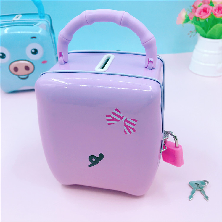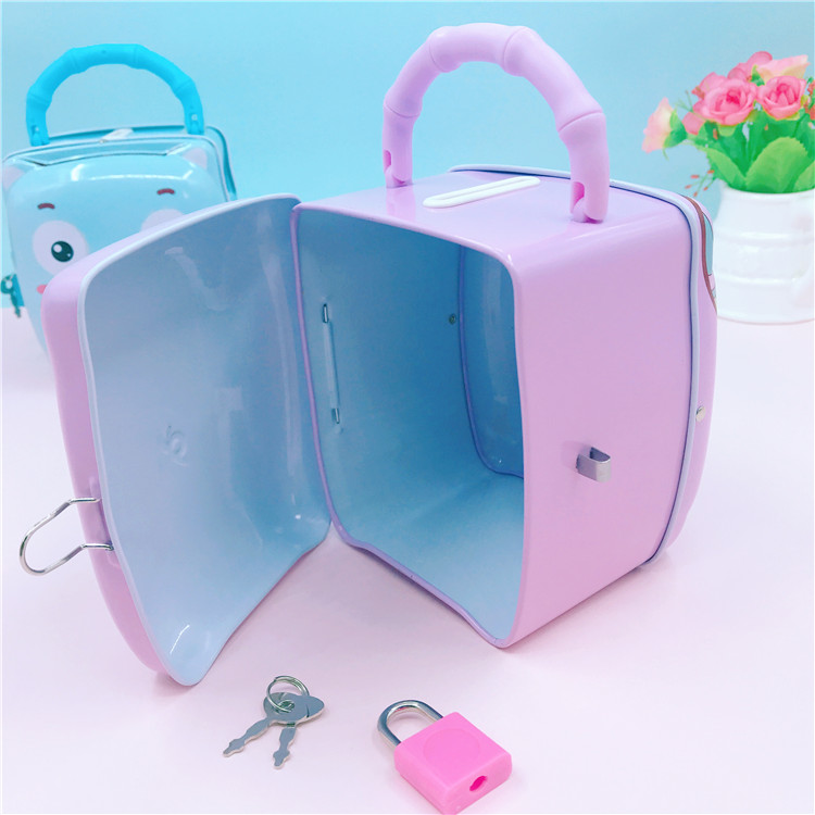 Children's iron box Cartoon piggy change piggy tinplate piggy bank with lock key gift blue