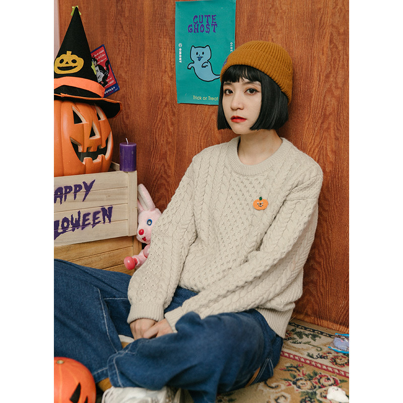 omont egg tart home Halloween loose round neck cable sweater women loose outer wear thick long-sleeved sweater autumn and winter