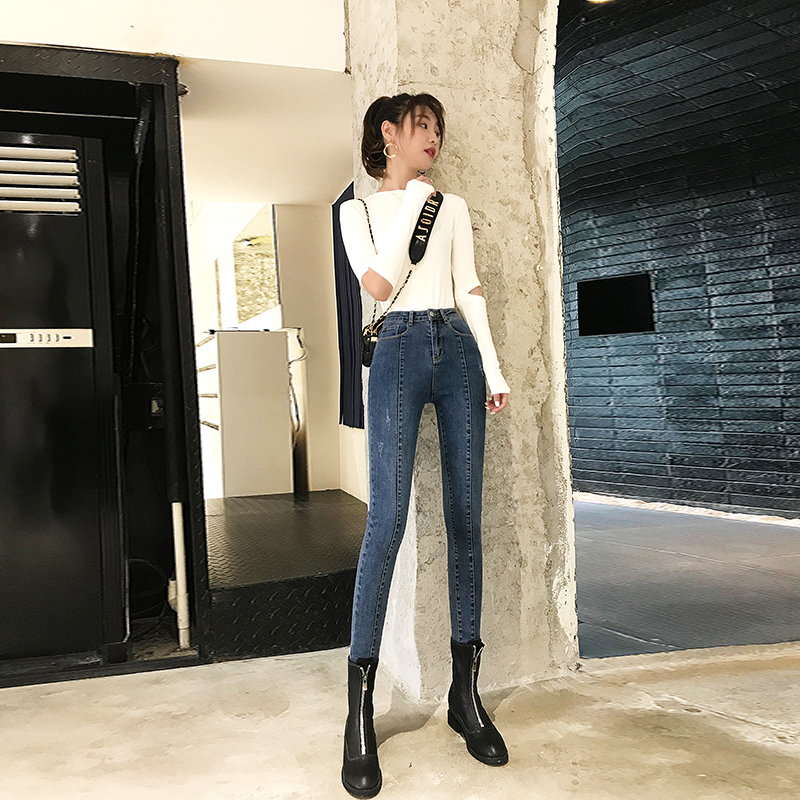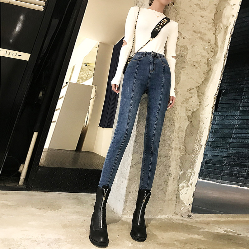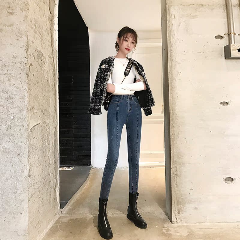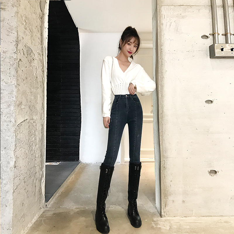 Denim cigarette tube pants women's 2021 new spring and autumn Hong Kong flavor high waist slim slim tight women's pants show high and wild
