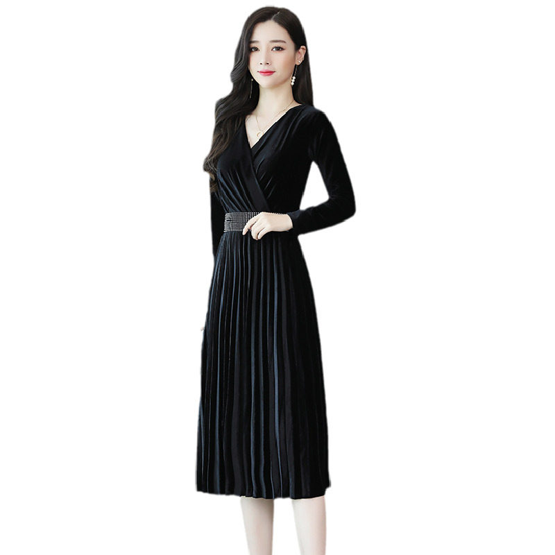 Early autumn fashion temperament long sleeve gold velvet dress 2021 new long version of women's Lady pleated skirt