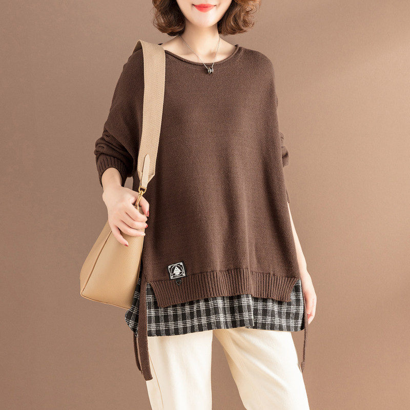 Hanshebali fake two-piece sweater women's pullover 2019 autumn and winter new wild plaid stitching knitted base top