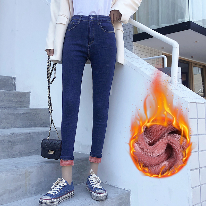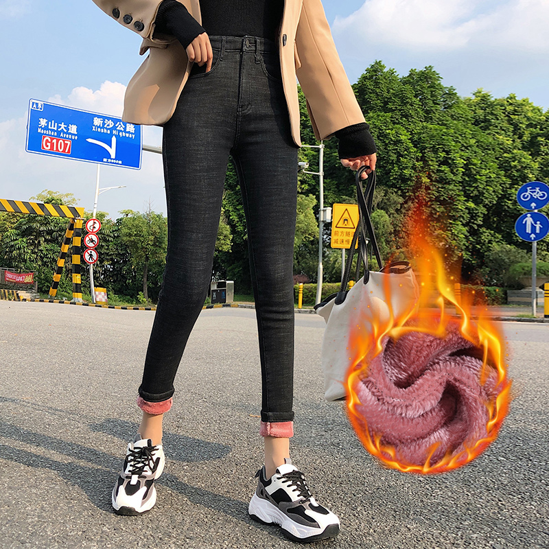 High waist plus suede thickened jeans female winter 2021 new display slim elastic band suede outside wearing black narrow tube tight fit pants