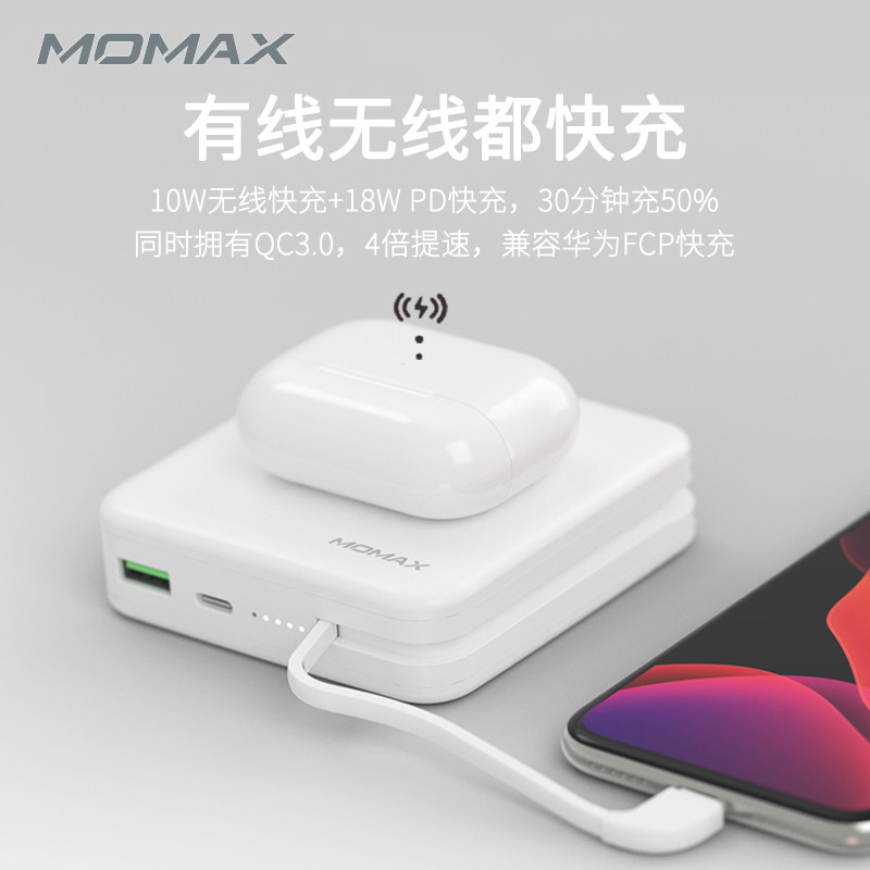 MOMAX Morims Wireless Mobile Charging Charger Two-in-one for Huawei Phone Apple MFI Certified Bring Your Own Line PD Fast-charging 18W SMALL PORTABLE LARGE CAPACITY ACTION POWER PLUG