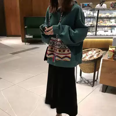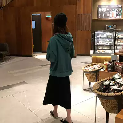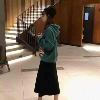 Green thick T-shirt black skirt
